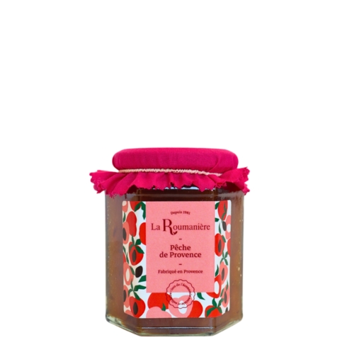 Ingrédients : Pêches de Provence, sucre de canne blanc. Préparée avec 75 g de fruits pour 100 g de confiture. Teneur totale en sucres après cuisson : 62 g pour 100 g. Peut contenir des traces de fruits à coque.